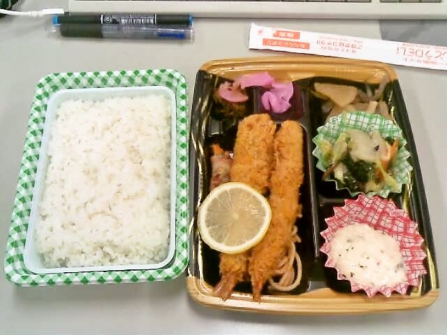 日替わり弁当 弁当日記 X Facebook Hatena Bookmark Pocket LINE Copy 2012.11.12 11月12日 お昼は日替わり弁当 メインは厚手の衣に包まれたエビフライ。 身の大きさから考えると技術力を感じます。