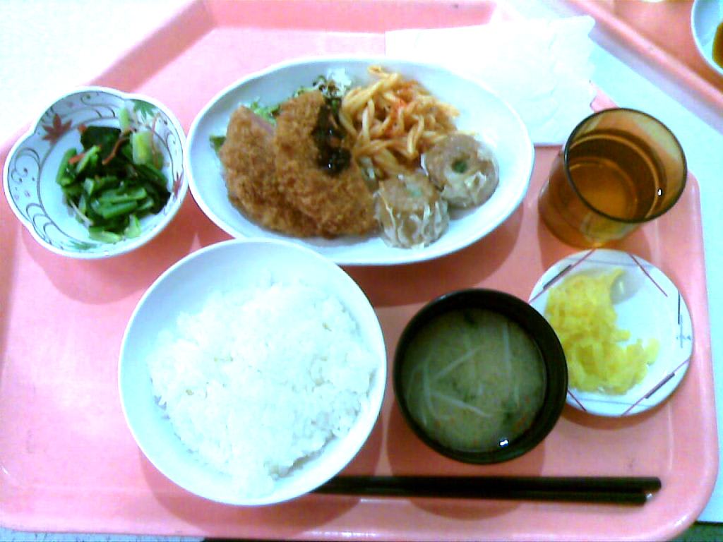 お昼は、ハムカツと焼売の定食。
